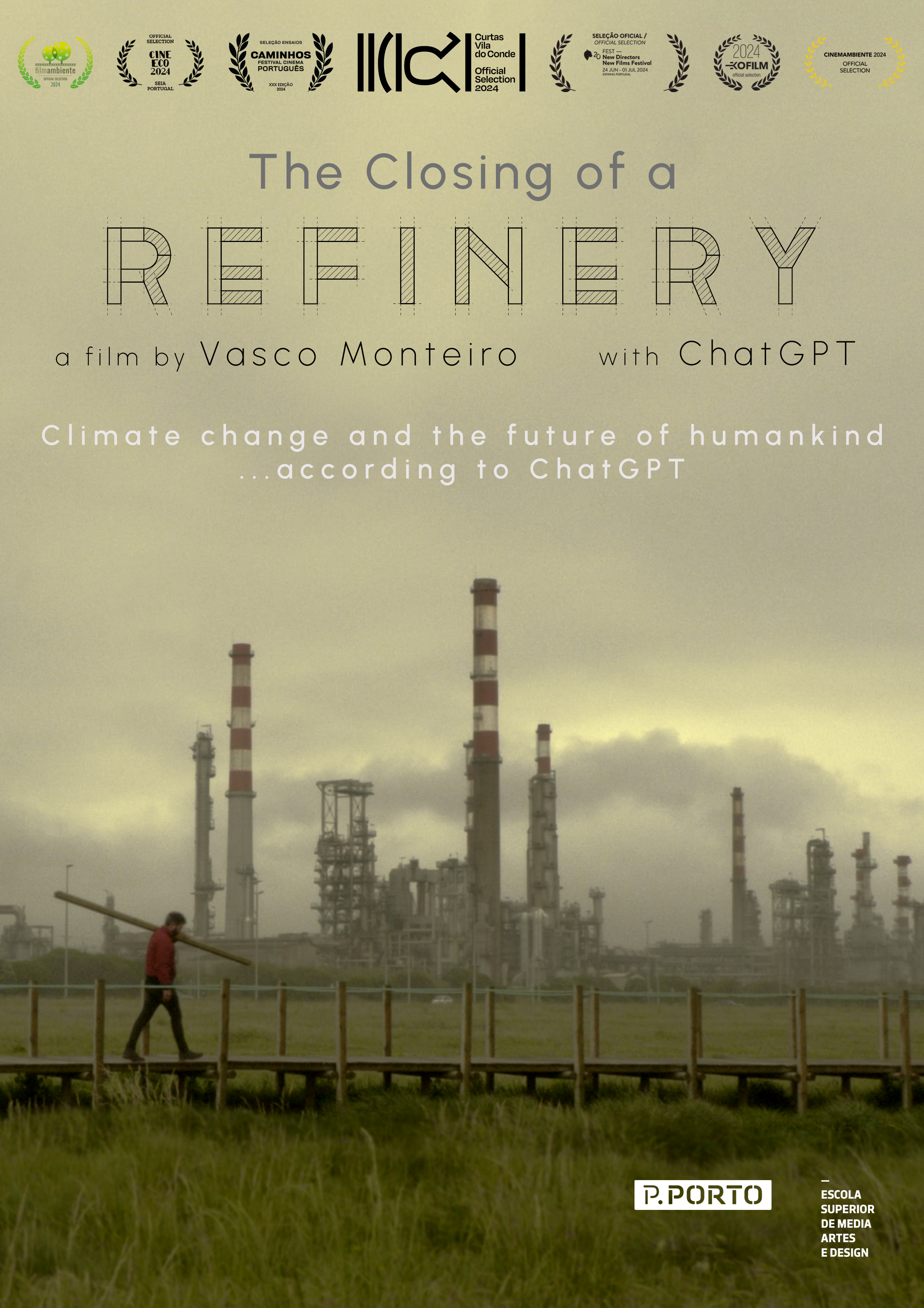 The Closing of a Refinery is an attempt to address the economic, environmental and social consequences of the green energy politics. The use of an AI text generative program, that parrots our human ideas, holds a mirror that highlights the sterile simplicity we often use in our discourse about climate change and sustainability. Instead of providing answers, this film aim’s to incite engagement with the existential challenge posed by our current climate crisis. Produced with Escola Superior de Media Artes e Design (ESMAD) as part of a master thesis in documentary film.